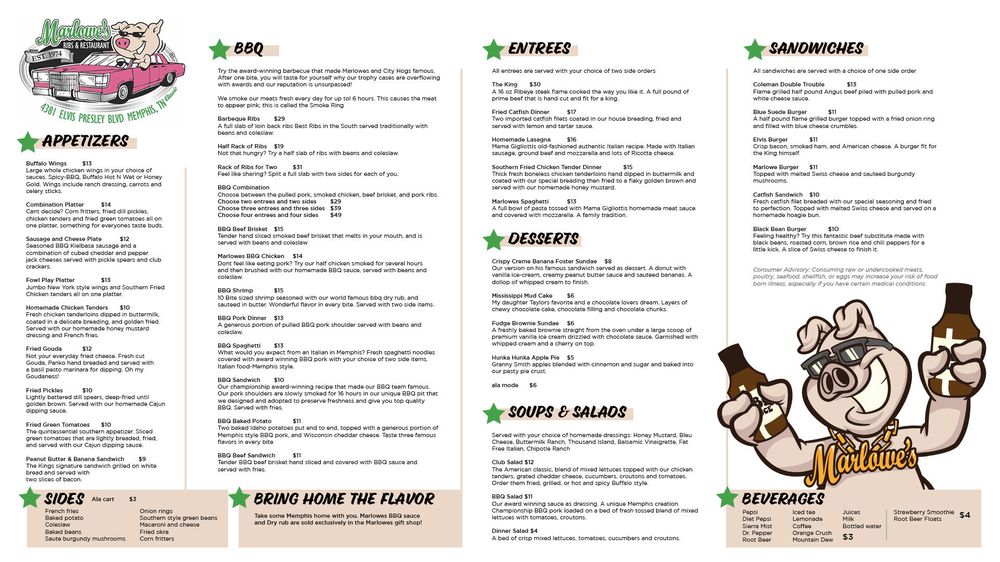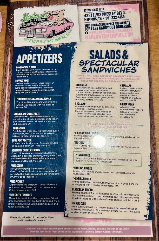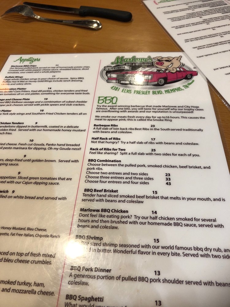 Marlowe's Ribs & Restaurant combines the best of desserts, sandwiches, and barbeque in a classy yet casual setting. Located at 4381 Elvis Presley Blvd in Memphis, TN, this restaurant offers a range of amenities including reservations, delivery, and takeout options. The menu features delicious ribs, sandwiches, and other barbeque delights, perfect for lunch or dinner. With a full bar, happy hour specials, and outdoor seating, Marlowe's is an excellent choice for groups, kids, and families. The friendly staff provides exceptional waiter service, making every dining experience memorable. Don't forget to try their signature dishes and enjoy the warm and inviting atmosphere at Marlowe's Ribs & Restaurant.